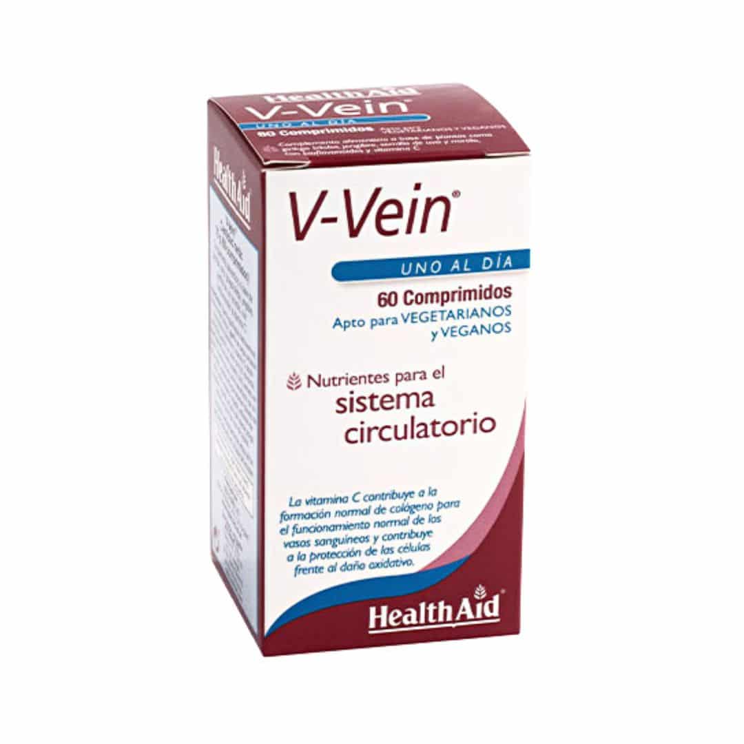 V-vein 60 comprimidos de Health Aid es un complemento alimenticio a base de plantas como ginkgo biloba, jengibre, semilla de uva y mirtilo, con bioflavonoides y vitamina C para el sistema circulatorio.